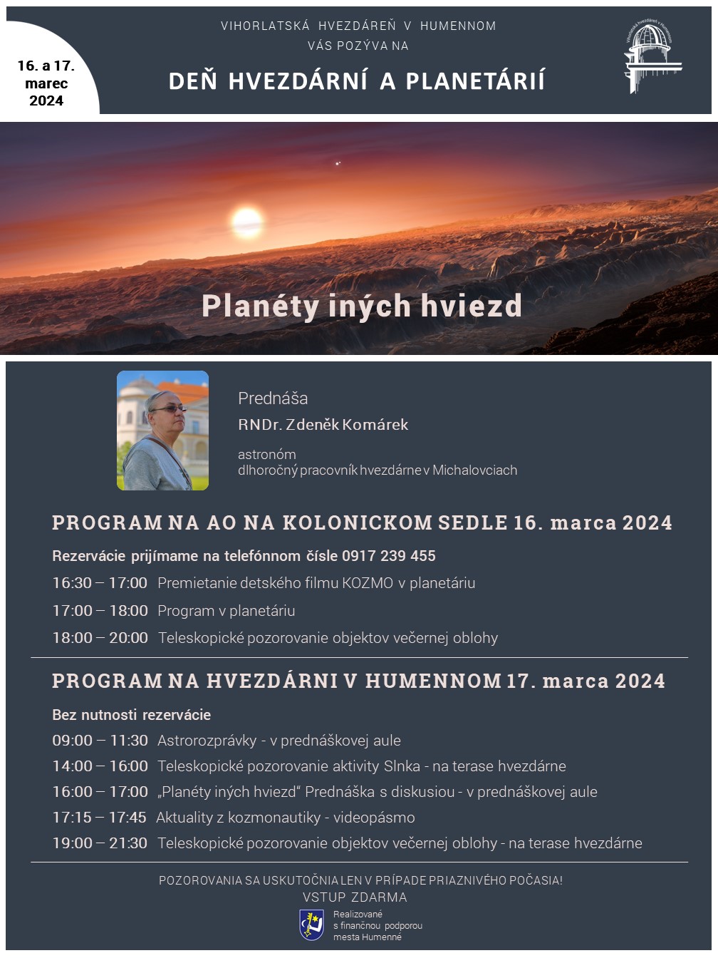 Vihorlatská hvezdáreň v Humennom ponúka pre záujemcov o astronómiu bohatý program na hvezdárni v Humennom a na jej detašovanom pracovisku – Astronomickom observatóriu na Kolonickom sedle. Práve tam prebehne program už v sobotu 16. marca 2024. V nedeľu sa mladší i starší môžu tešiť na celodenný program v humenskej hvezdárni s prednáškou RNDr. Zdenka Komáreka o planétach, ktoré obiehajú iné hviezdy v našej galaxii. Samozrejmosťou sú pozorovania objektov večernej oblohy, predovšetkým Mesiaca, ktorý bude v ideálnych podmienkach na pozorovanie, planéty Jupiter a rôznych otvorených hviezdokôp zimnej a jarnej oblohy. Časový harmonogram podujatia si môžete pozrieť na plagáte nižšie. Tešíme sa na Vás!