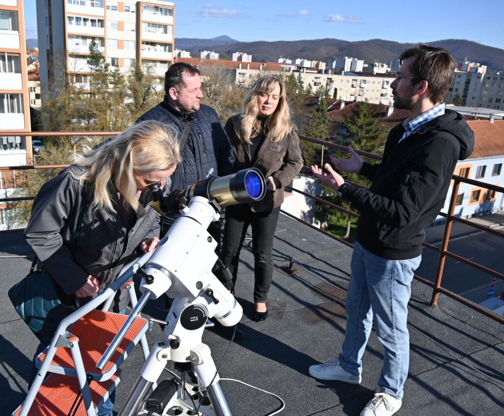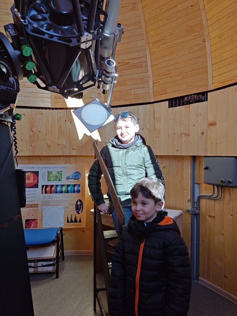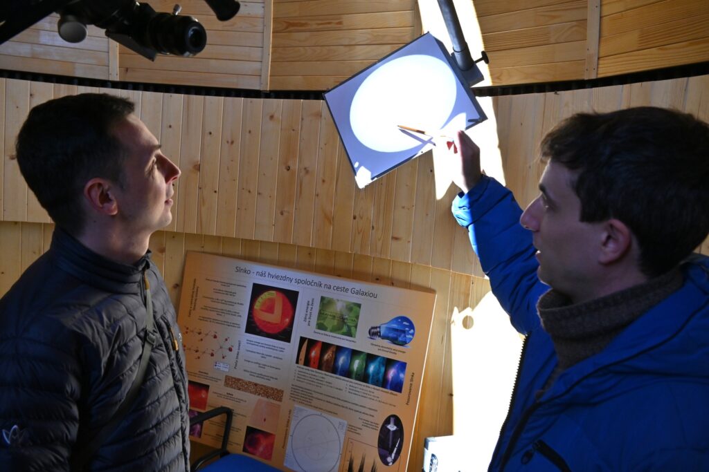 Jasné počasie v poobedných hodinách využili postupne desiatky návštevníkov na pozorovanie Slnka špeciálnym solárnym teleskopom na terase hvezdárne a projekčnou metódou v kupole.