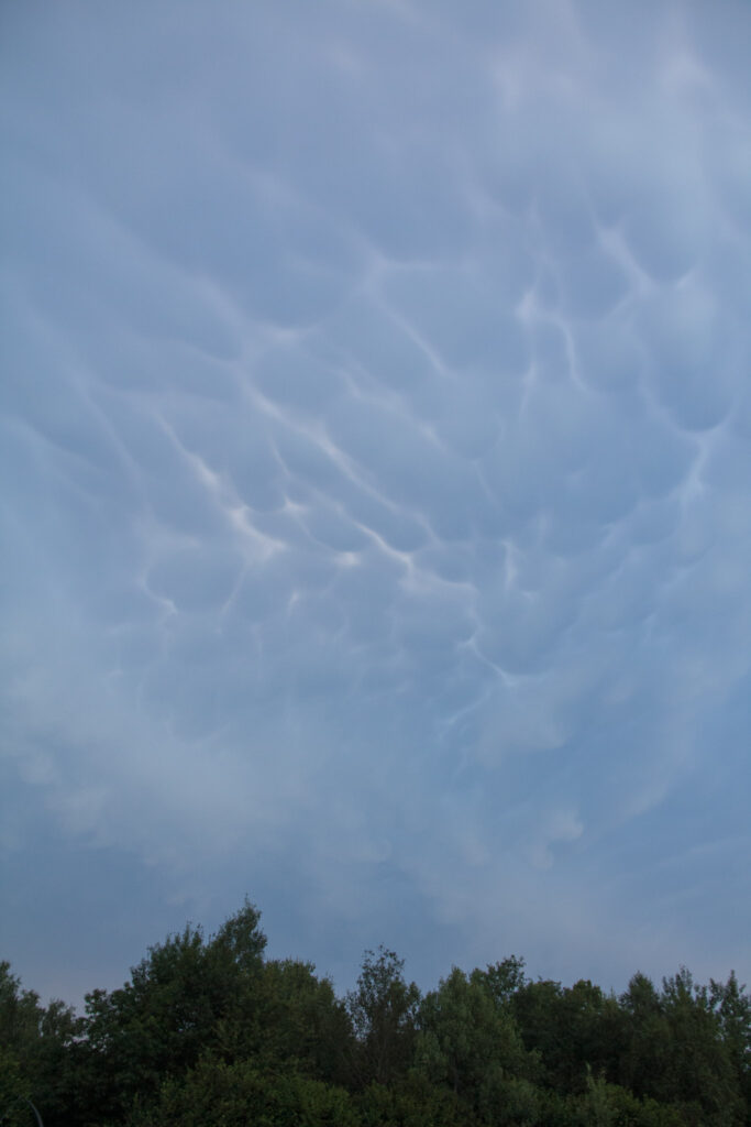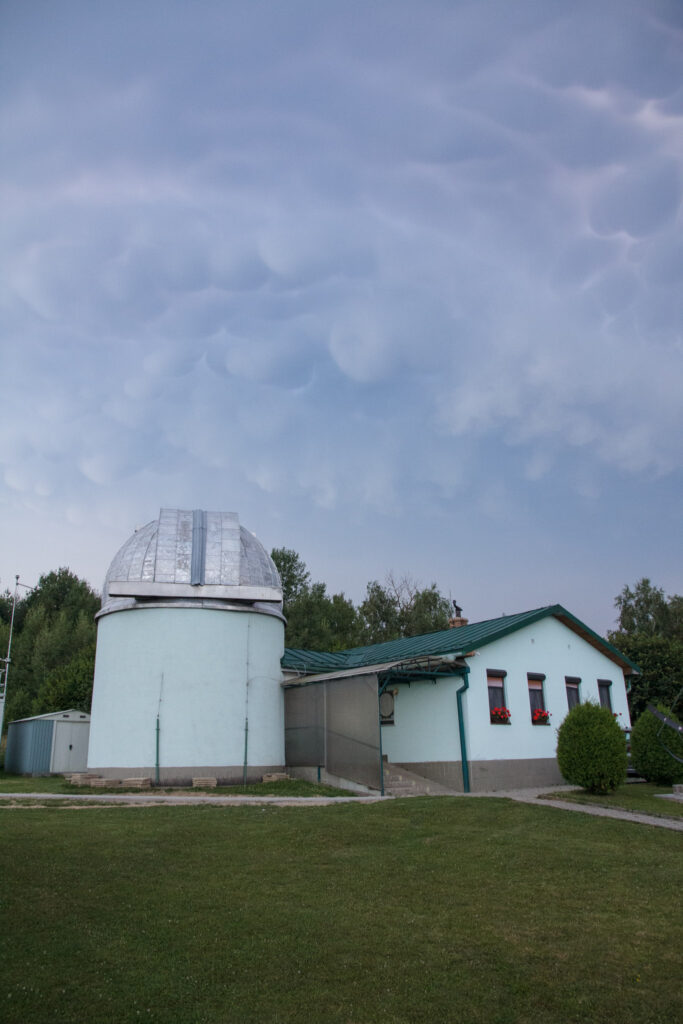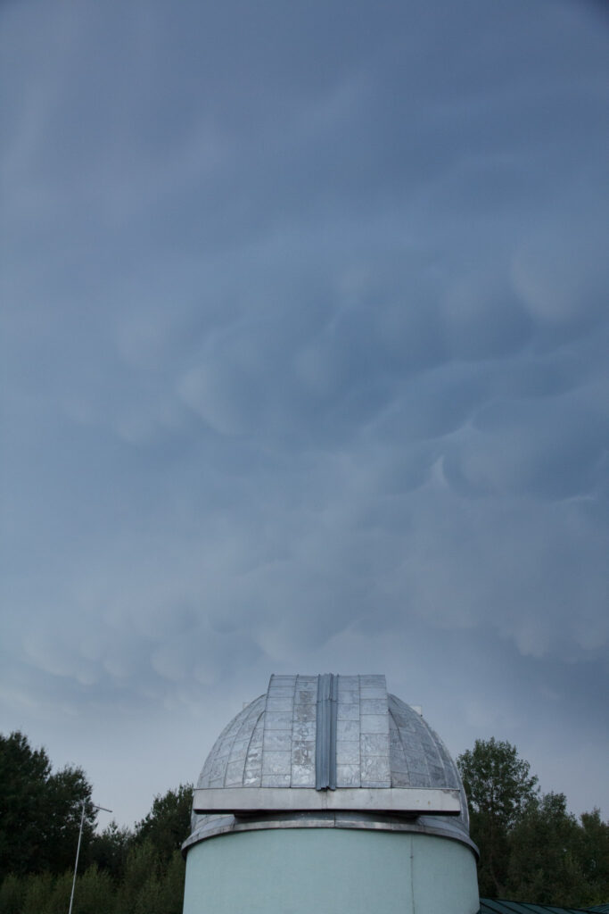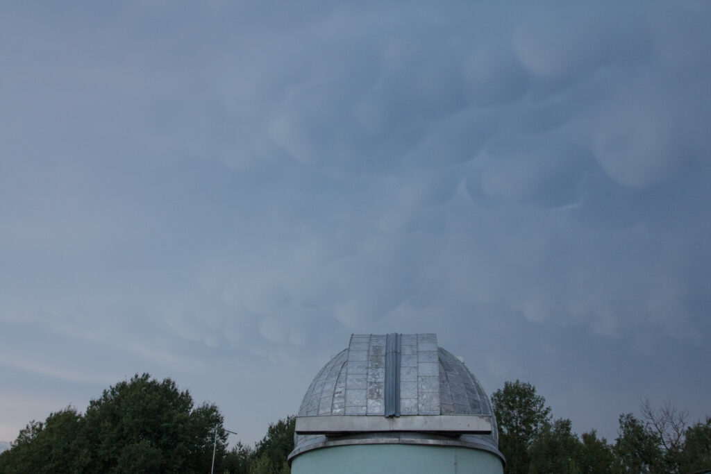Typické letné búrky observatórium zastihli až v nedeľu ráno avšak búrkové oblaky vo väčšej vzdialenosti umožnili vznik zaujímavej oblačnosti typu mammatus v sobotu popoludní. Tento názov vystihuje morfologickú zvláštnosť oblaku. Oblačná vrstva, v ktorej sa tvorí nie je homogénna, ale má zaoblené výbežky orientované od základne (materského) oblaku smerom dolu. Najčastejšie sa mammatus vyskytuje v zadnej časti oblaku druhu Cumulonimbus, teda v oblasti zostupných prúdov vzduchu. Môže sa vyskytnúť tiež pri oblakoch Stratocumulus, Altocumulus, Altostratus, Cirrus a Cirrocumulus, avšak v týchto prípadoch ide väčšinou o menej výrazné výbežky (v porovnaní s mammatusom na Cumulonimbe). Podľa hladiny, v ktorej sa mamma vyskytuje a podľa okolitého oblačného systému sa tieto oblaky delia na tri typy: Altostratus mamma, Cumulonimbus mamma a Altocumulus mamma. Prvý druh vzniká na základni zvlneného altostratusu, v prípade ak sa pod ním nachádza inverzná vrstva a relatívna vlhkosť vzduchu s výškou stúpa. Ďalšie dva typy patria do zoskupenia oblakov v Cumulonimbe. Altocumulus mamma súvisí s brzdiacou inverznou vrstvou, na ktorej sa zastavil vývoj Cumulonimbu, s ktorým je tento Altocumulus spojený. (Zdroj: Oficiálna stránka SHMÚ na facebooku)