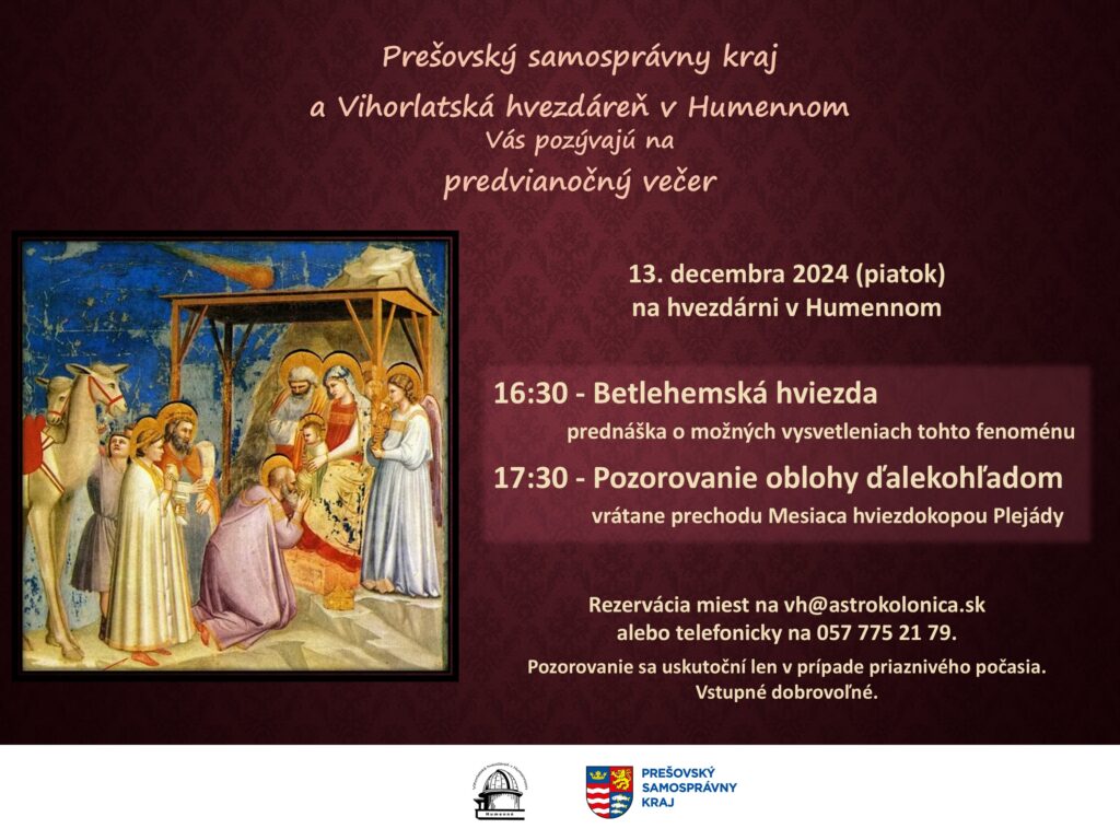 V piatok 13. decembra 2024 si podvečer o 16.30 hod. porozprávame o možných vysvetleniach betlehemskej hviezdy, ktorú poznáme z Biblie, zo statí viažucich sa k Vianociam.