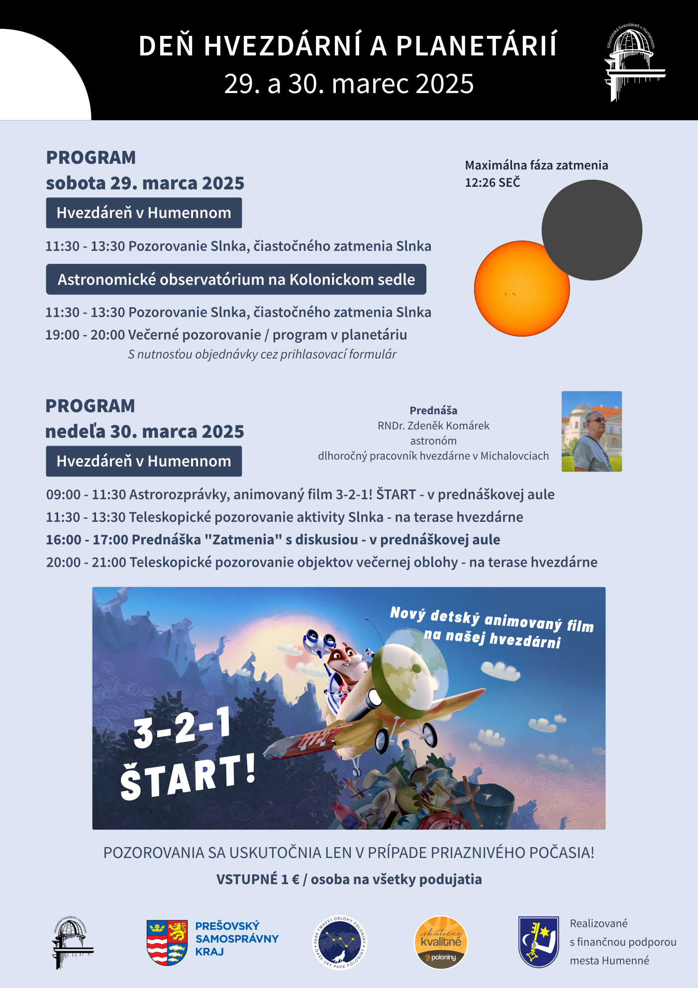 Nedeľný program (len na hvezdárni v Humennom) začne rozprávkami s astronomickou tematikou pre najmenších návštevníkov a prvý krát budeme premietať aj nový animovaný film „321 ŠTART!“. Hlavný popoludňajší program vyplní prednáška nášho kolegu RNDr. Zdenka Komáreka o zatmeniach Slnka a Mesiaca od 16:00. Ak to počasie dovolí, pozorovať budeme aj vo večerných hodinách, predovšetkým planéty Jupiter a Mars, ale aj ďalšie objekty zimnej a jarnej oblohy. Časový harmonogram podujatia si môžete pozrieť na plagáte nižšie. Tešíme sa na Vašu návštevu.