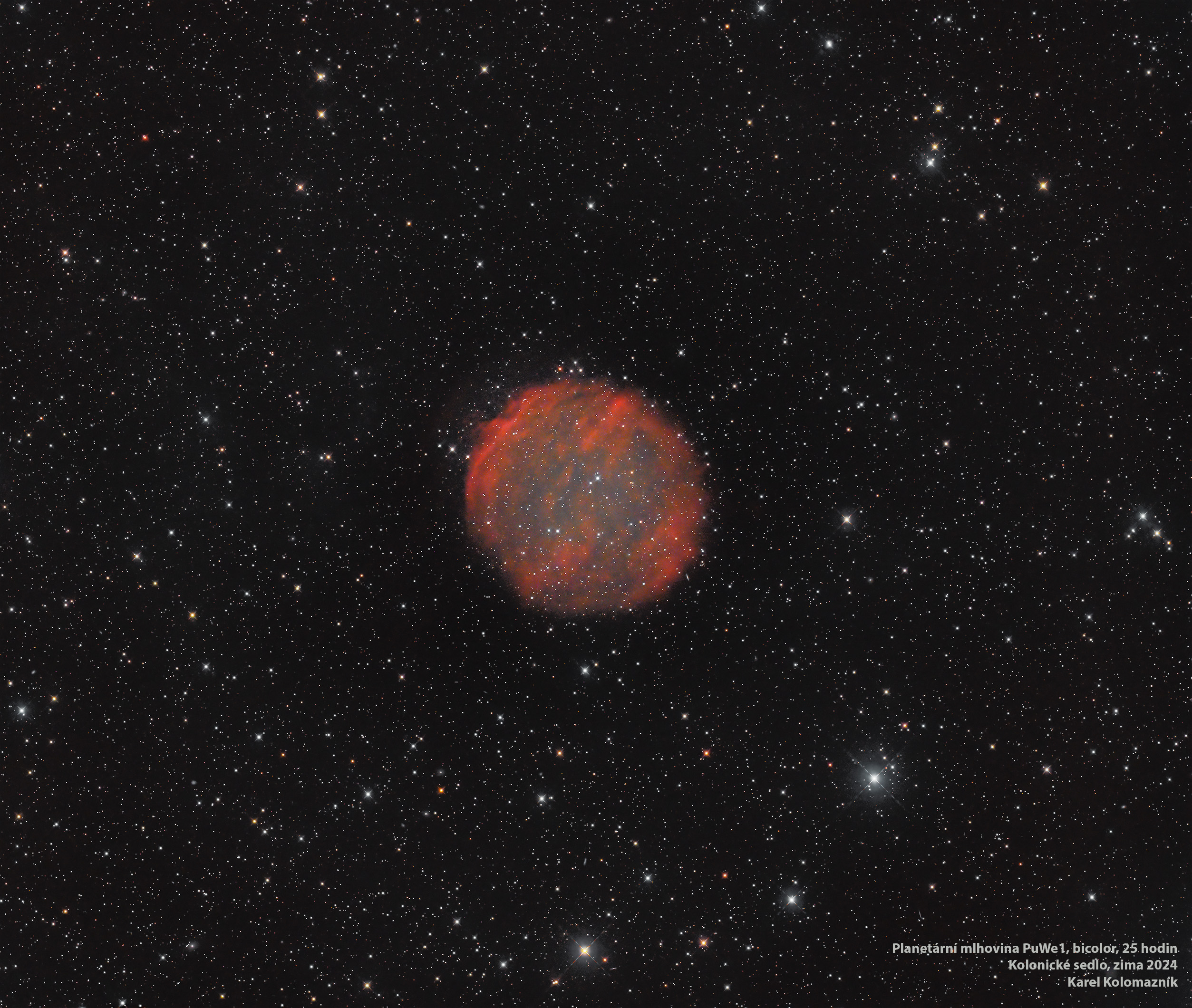 Mimořádné nebe v poloninské oblasti tmavé oblohy umožnilo nasnímat i tak slabý objekt, jako je jedna z „novějších“ planetárních mlhovin PuWe1 objevená roku 1980. Vidíme na ní, proč tento druh mlhovin získal svoje přízvisko „planetární“. Opravdu vypadá, jako by to byl koutouček nějaké vzdálené planety, anebo v tomto případě snad i Měsíce, protože jde o opravdu velkou mlhovinu.